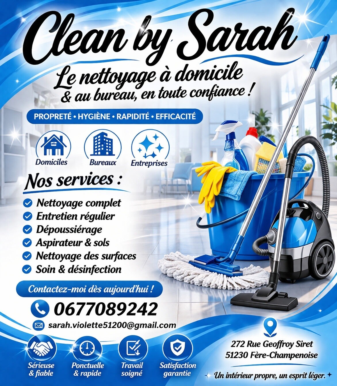 "Cleanbysarah a transformé mon appartement ! Le service était impeccable, rapide et les résultats sont au-delà de mes attentes. Je recommande vivement leur professionnalisme."